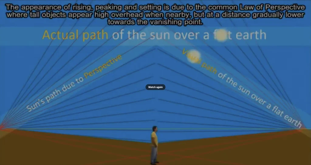 Watch as a we zoom into a half-set sun which is shown to actually be above the distant horizon and simply vanishing into the “vanishing point” of the Law of Perspective!